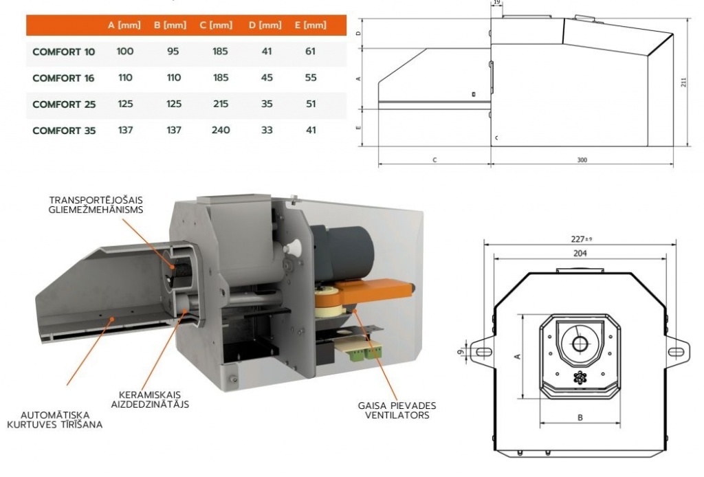 Comfort sērijas degļi ir ierīces, kuru darbība balstīta uz kustīgo ārdu principa. Tā ir pārbaudīta un uzticama sistēma degļa attīrīšanai no uzdeguma un pelniem, kas veidojas granulu sadegšanas procesā. Kustīgās ārdu sistēmu mēs izmantojam kopš automātisko degļu ražošanas sākuma. Citu tehnisko risinājumu un zīmolu komponentu pielietošana padara degli par uzticamu un bezapkopes ierīci. Pateicoties keramiskajam aizdedzinātājam, uguns iedegas ļoti ātri, kas samazina arī elektroenerģijas patēriņu. Reduktors ar zobratu pārnesi un radiālais ventilators ir efektīvas un ļoti klusas ierīces. Rūpīga izgatavošana un augstas kvalitātes materiāli, kas izmantoti degļa konstrukcijā, nodrošina tā ilgstošu un drošu darbību.